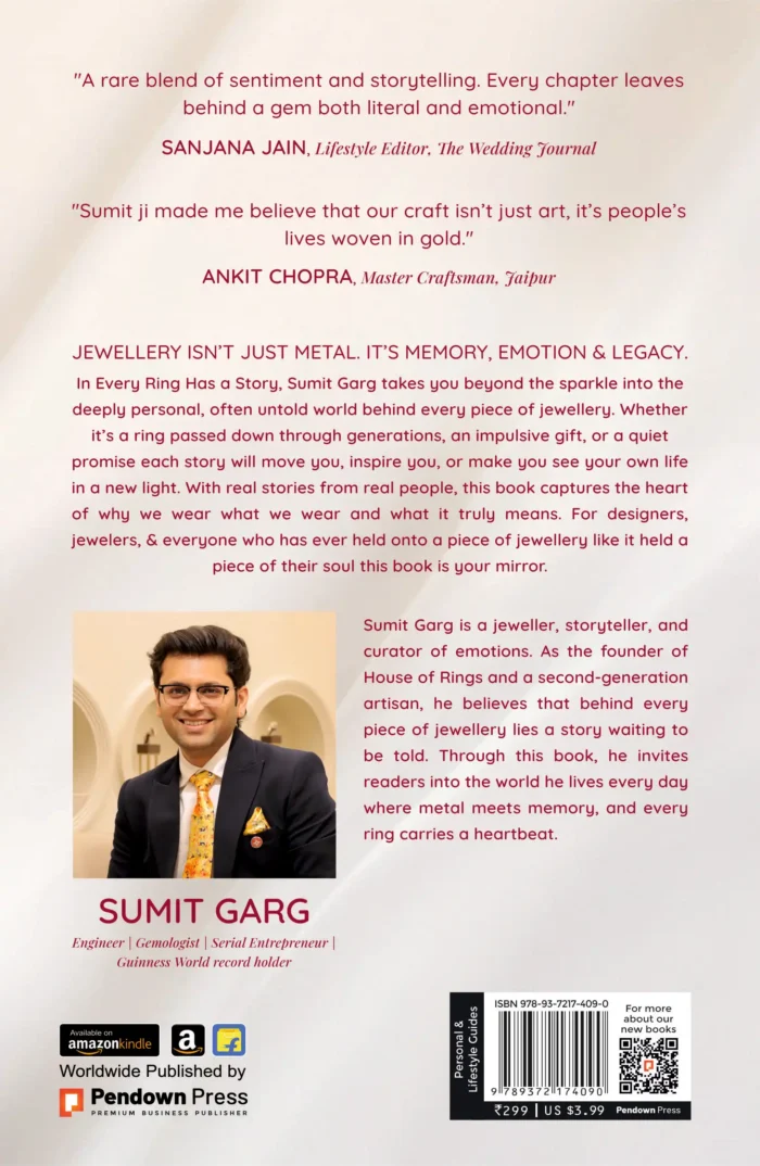 Sumit Garg is a jeweller, storyteller, and curator of emotions. As the founder of House of Rings and a second-generation artisan, he believes that behind every piece of jewellery lies a story waiting to be told. Through this book, he invites readers into the world he lives every day where metal meets memory, and every ring carries a heartbeat.