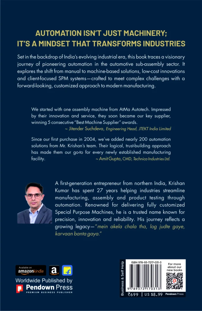 Set in the backdrop of India’s evolving industrial era, this book traces a visionary journey of pioneering automation in the automotive sub-assembly sector. It explores the shift from manual to machine-based solutions, low-cost innovations and client-focused SPM systems-crafted to meet complex challenges with a forward-looking, customized approach to modern manufacturing.